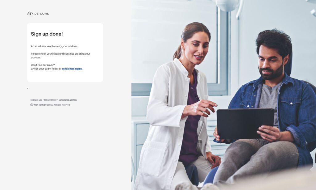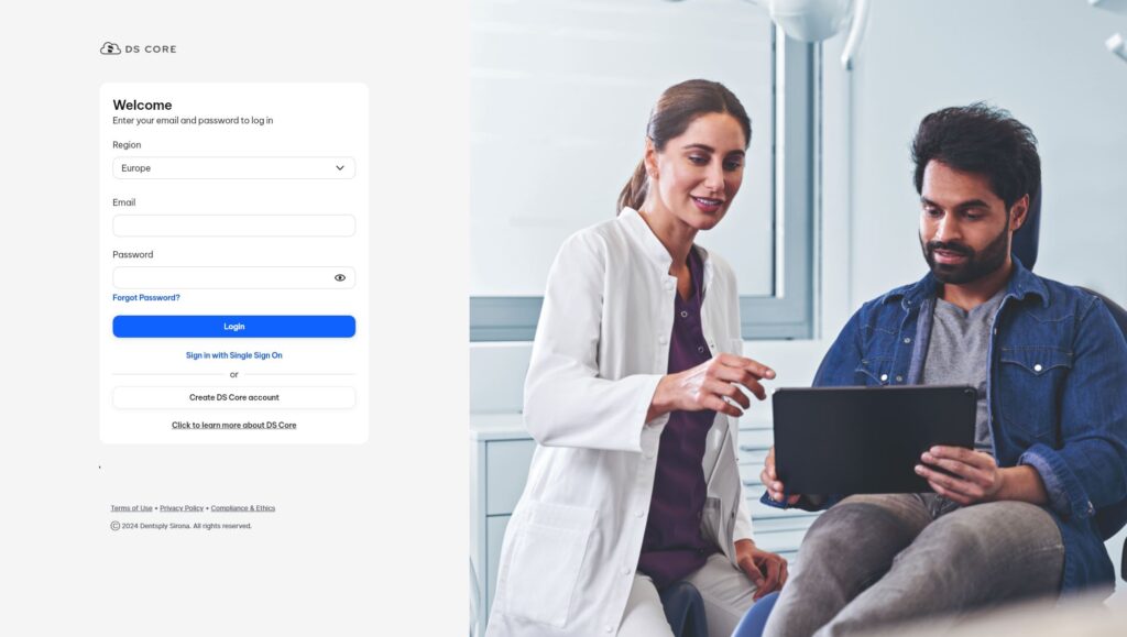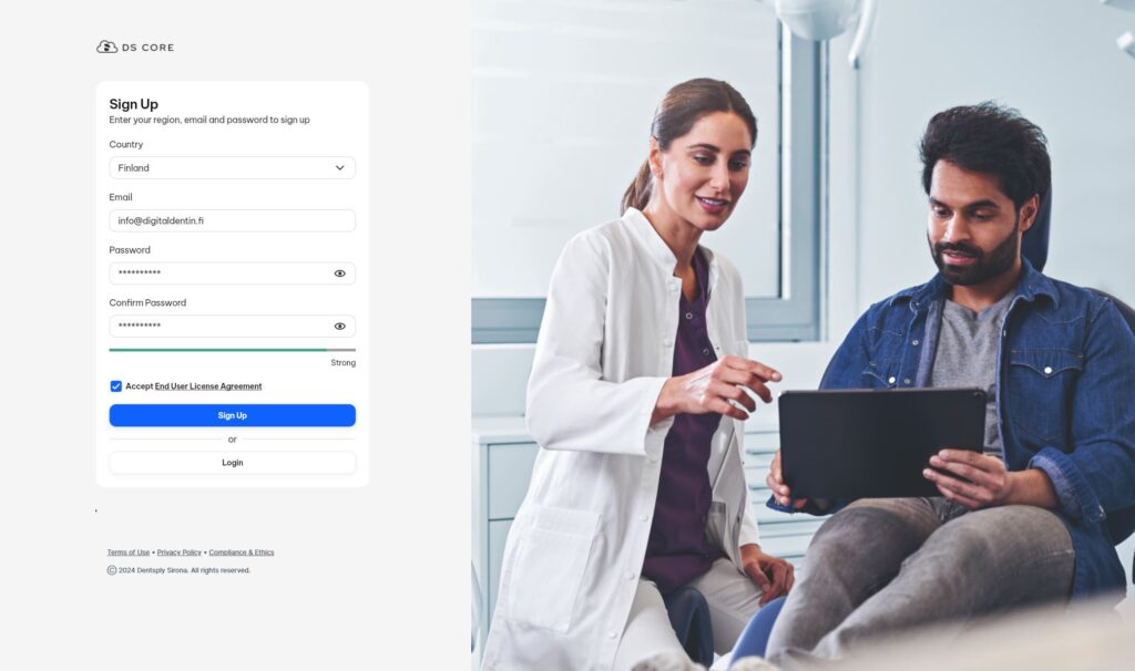 Seuraavaksi kirjaudu tilillesi, valitse alueeksi Eurooppa ja kirjoita juuri syöttämäsi tiedot. Saat valinnaksi tehdäänkö hammaslääkäriasema vai laboratorio. Valitse tässä tilanteessa Dental practice