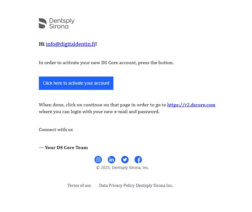 Hammaslääkäriaseman täytyy valita ylläpitäjä, joka perustaa tilin asemalle ja hallinnoi koko palettia. Tili kannattaa tehdä esim vastaanoton sähköpostitunnuksen alle jolloin se ei henkilöidy yhteen tiettyyn ihmiseen. Tällä on vaikutusta esim jos pääkäyttäjä vaihtaa työpaikkaa tai laitteiden yhdistyksessä DI & CAD/CAM Connectorilla. Alla on käyty yksityiskohtaisesti läpi, miten tili luodaan. Mene ensin osoitteeseen https://r2.dscore.com/