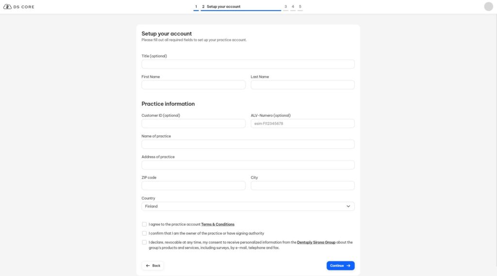 Seuraavaksi täytetään hammaslääkäriaseman tiedot, lisää vähintään vaaditut tiedot, jotta pääset eteenpäin. Katso että täytät tiedot oikein ja varmista että maa-kohdassa on Finland