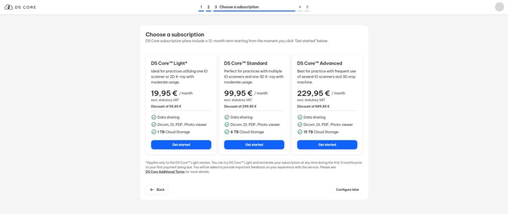 Seuraavaksi pääset valitsemaan minkälaisen tilauksen haluat tehdä, mikäli et ole vielä varma tai haluat käyttää maksutonta versiota, klikkaa Configure later. Voit aina jälkikäteen käydä tilausta muuttamassa.