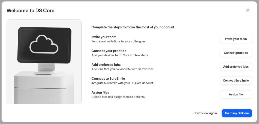 Nyt tilin luonti on valmis, saat eteesi kuvanmukaisen kohdan, joka auttaa sinua pääsemään tilin luomisessa alkuun. Seuraavaksi päästään lisäämään muut hammaslääkärit, yhteistyölaboratoriot ja käyttämään palvelua!